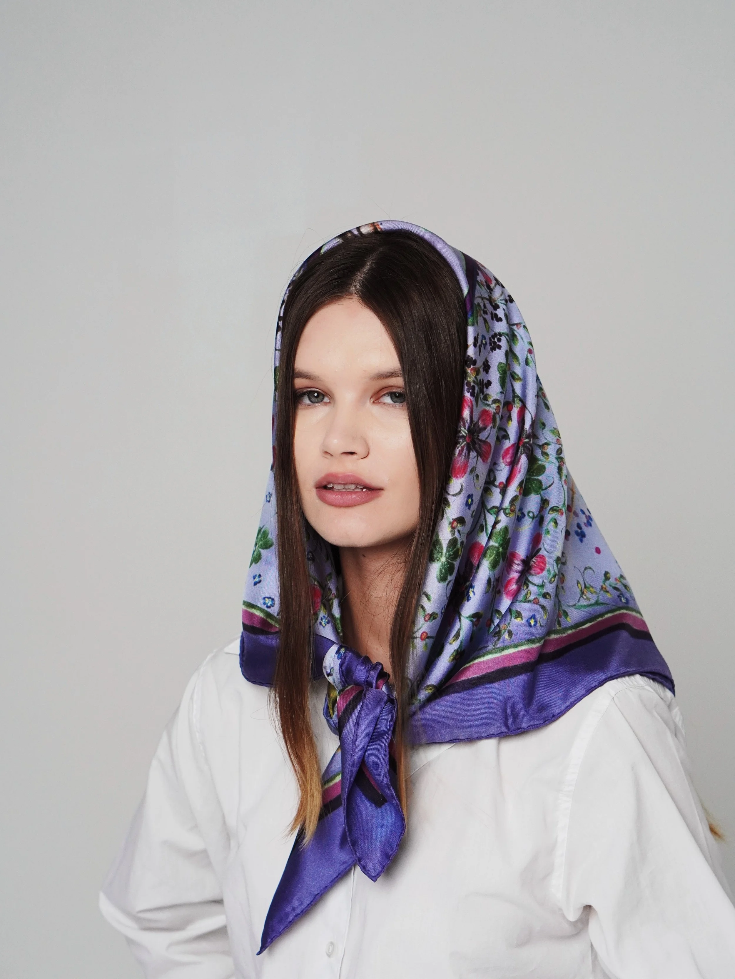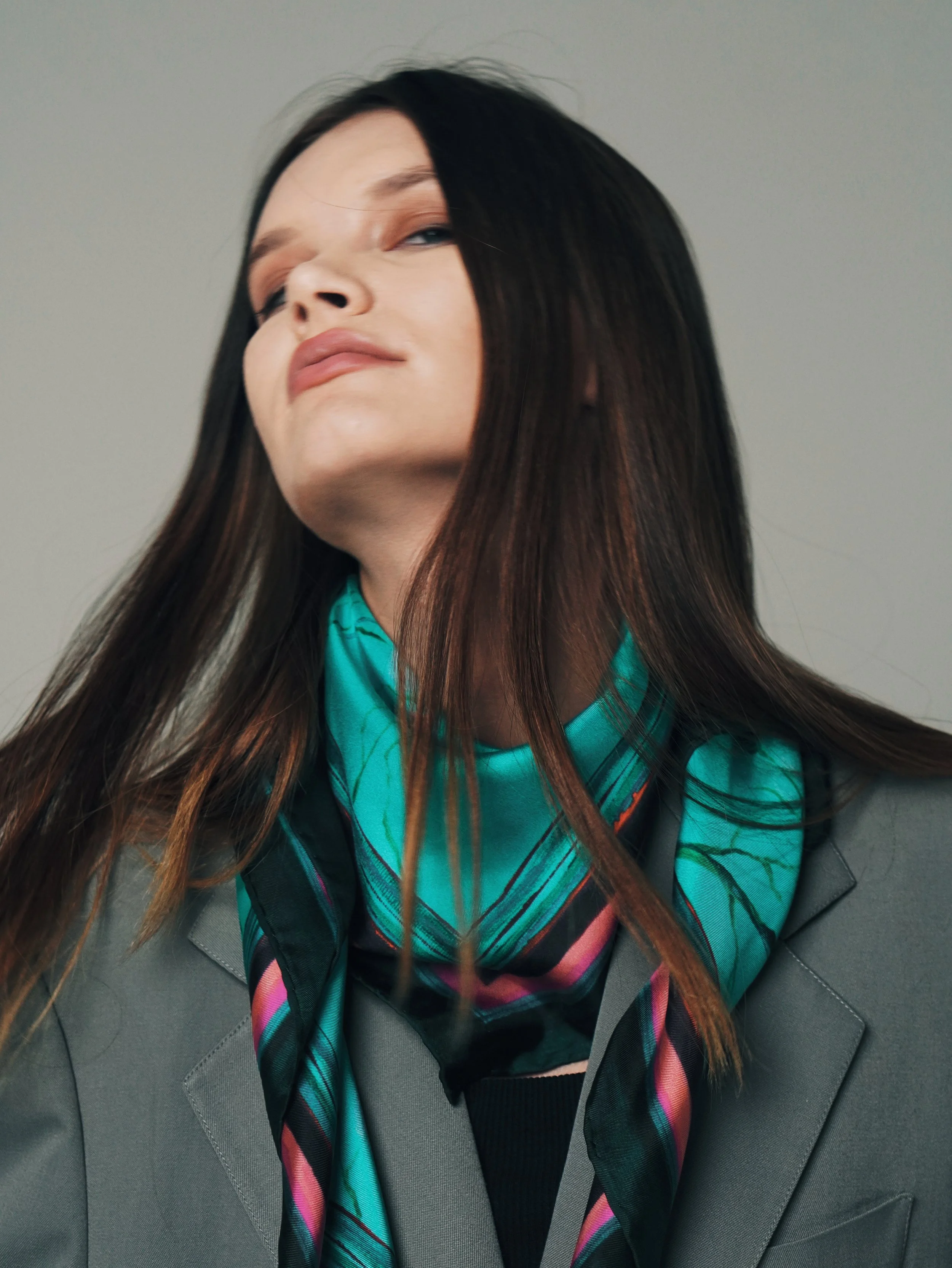 A woman with dark brown hair, lightly tanned skin, wearing a gray blazer and a colorful silk scarf, looks confidently at the camera with a slight smile.