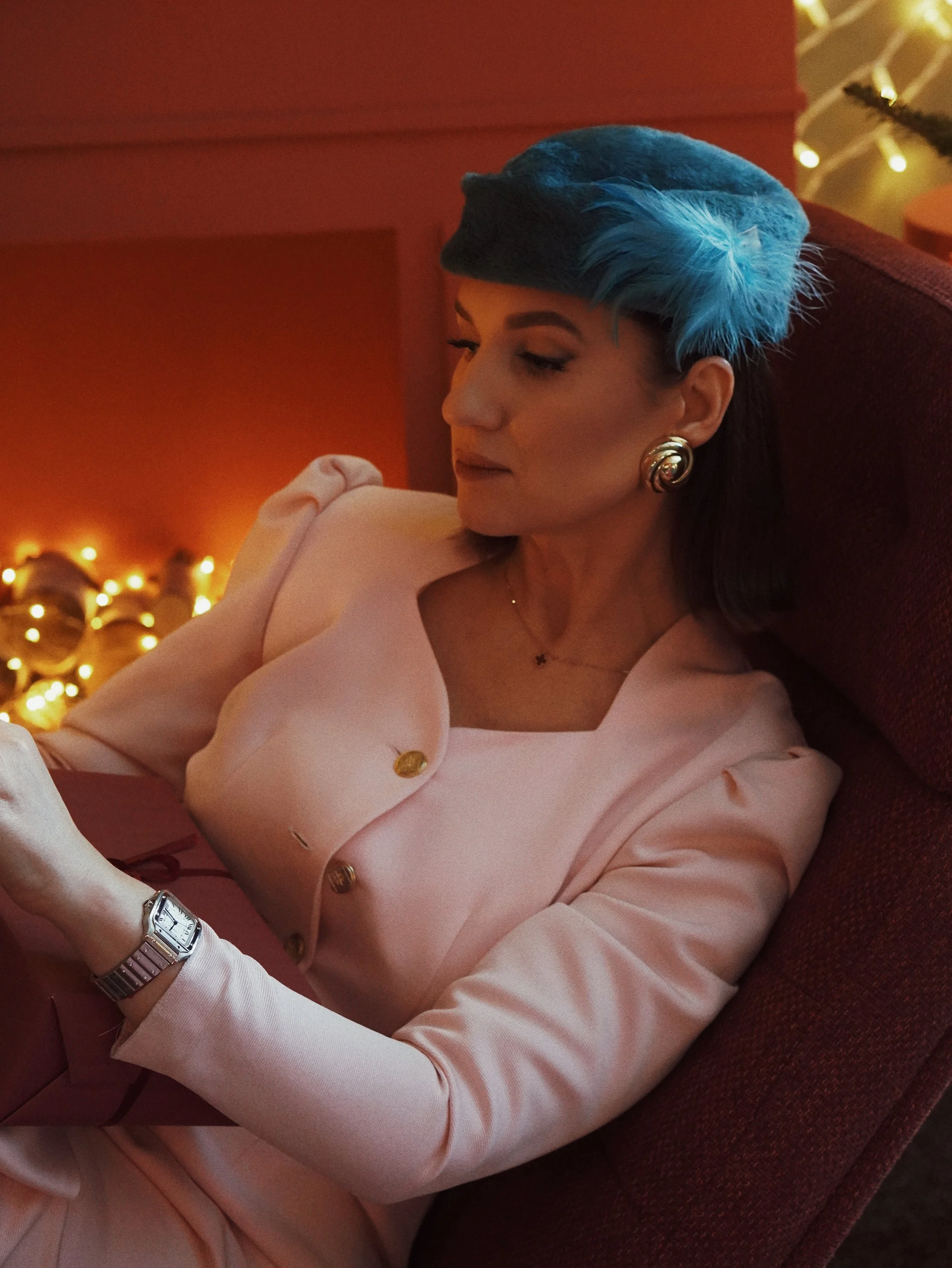 A woman wearing a large black hat with the brim covering her eyes, a black blazer, and a chunky pearl necklace, being assisted with her outfit by another person adjusting her shoulder. The background shows light-colored vertical blinds.