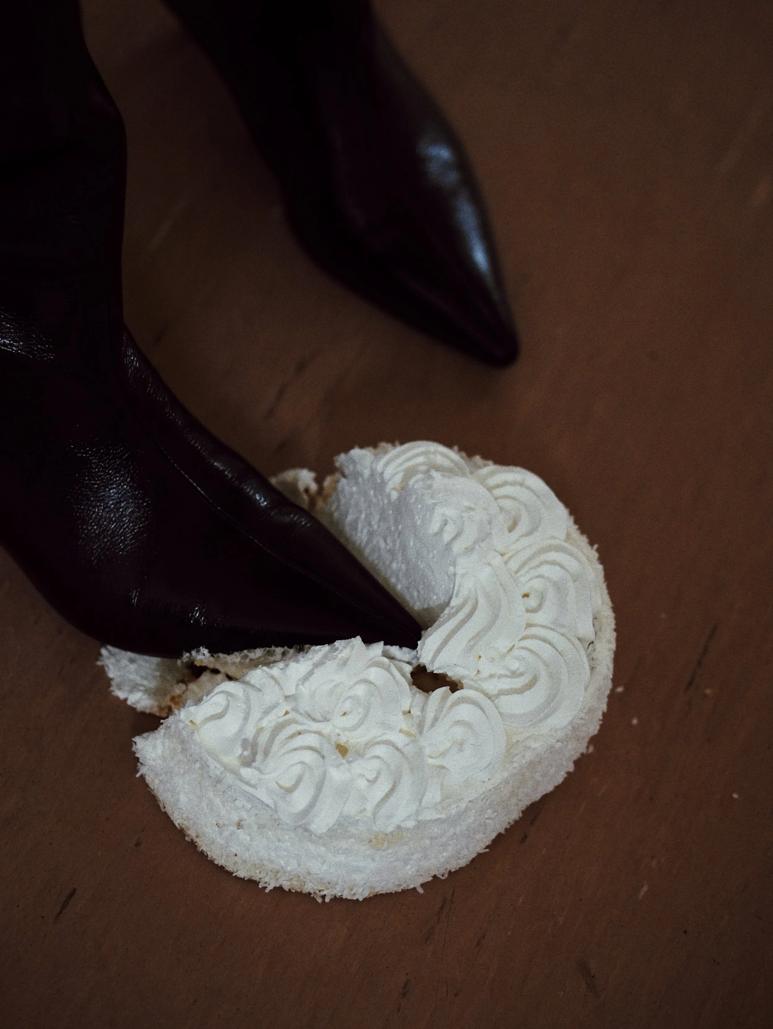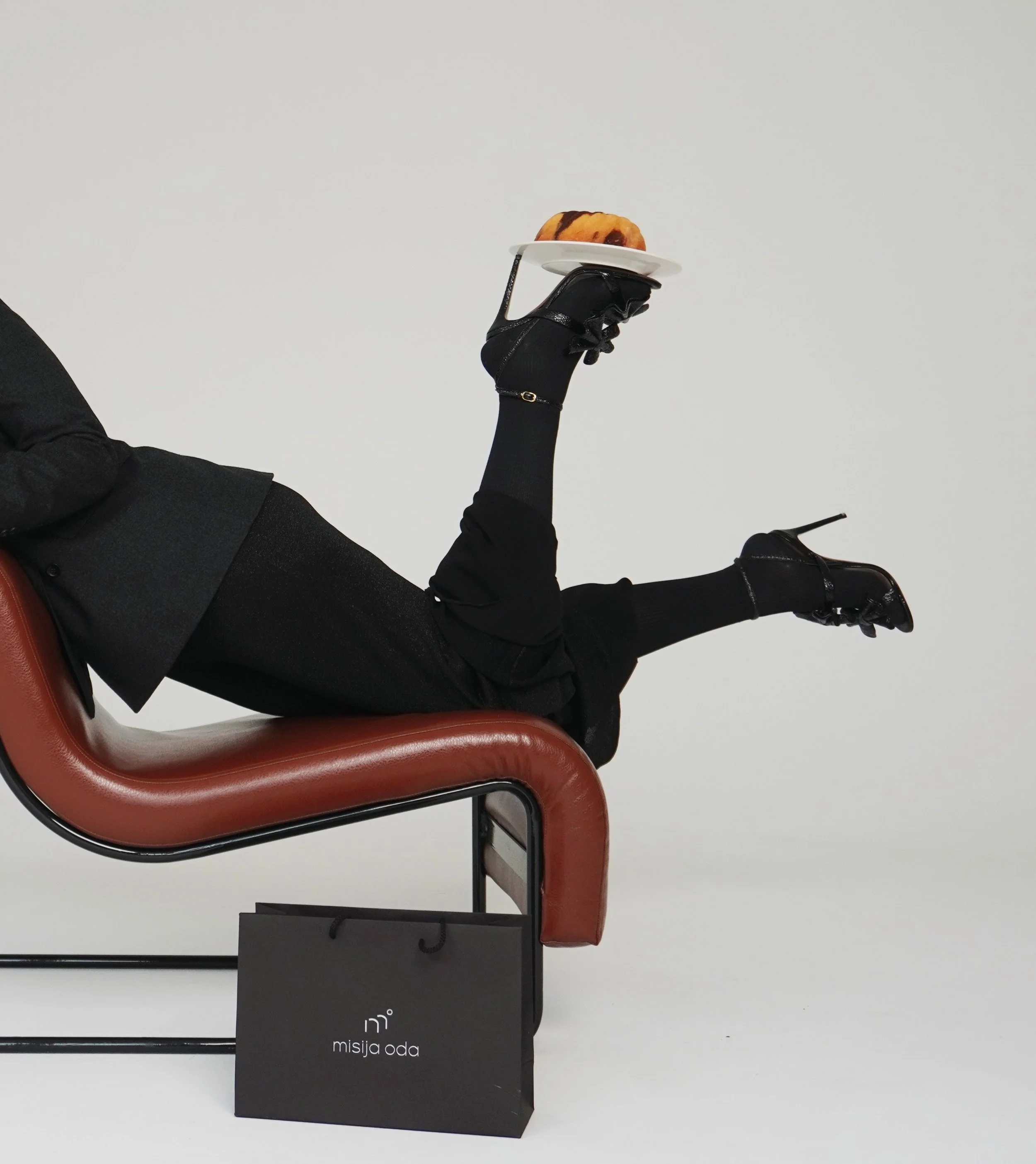 Person in black clothing and high-heeled shoes lying on a brown leather bench, holding a plate with a piece of pastry, with a black shopping bag that says 'misja oda' on the floor.