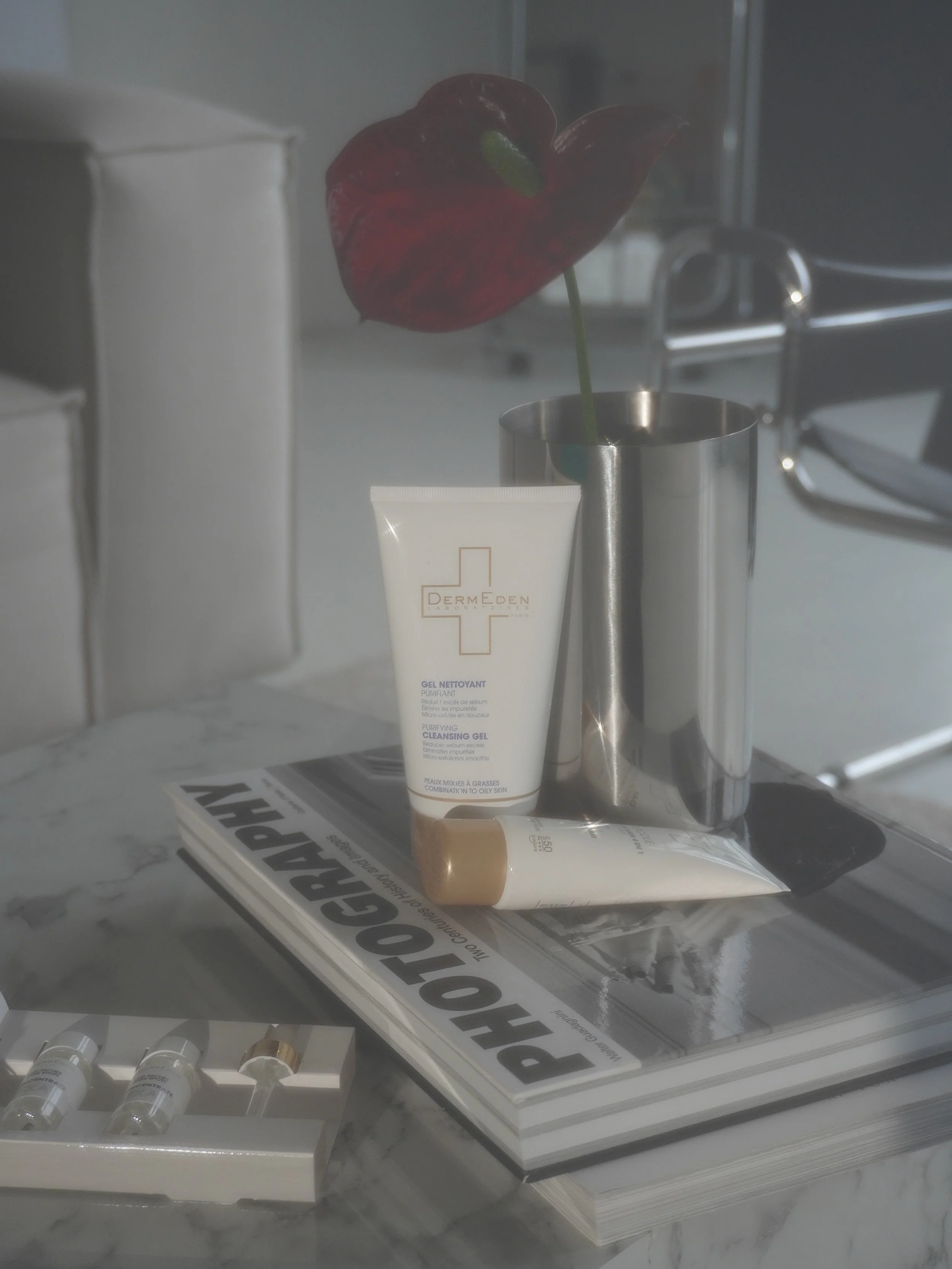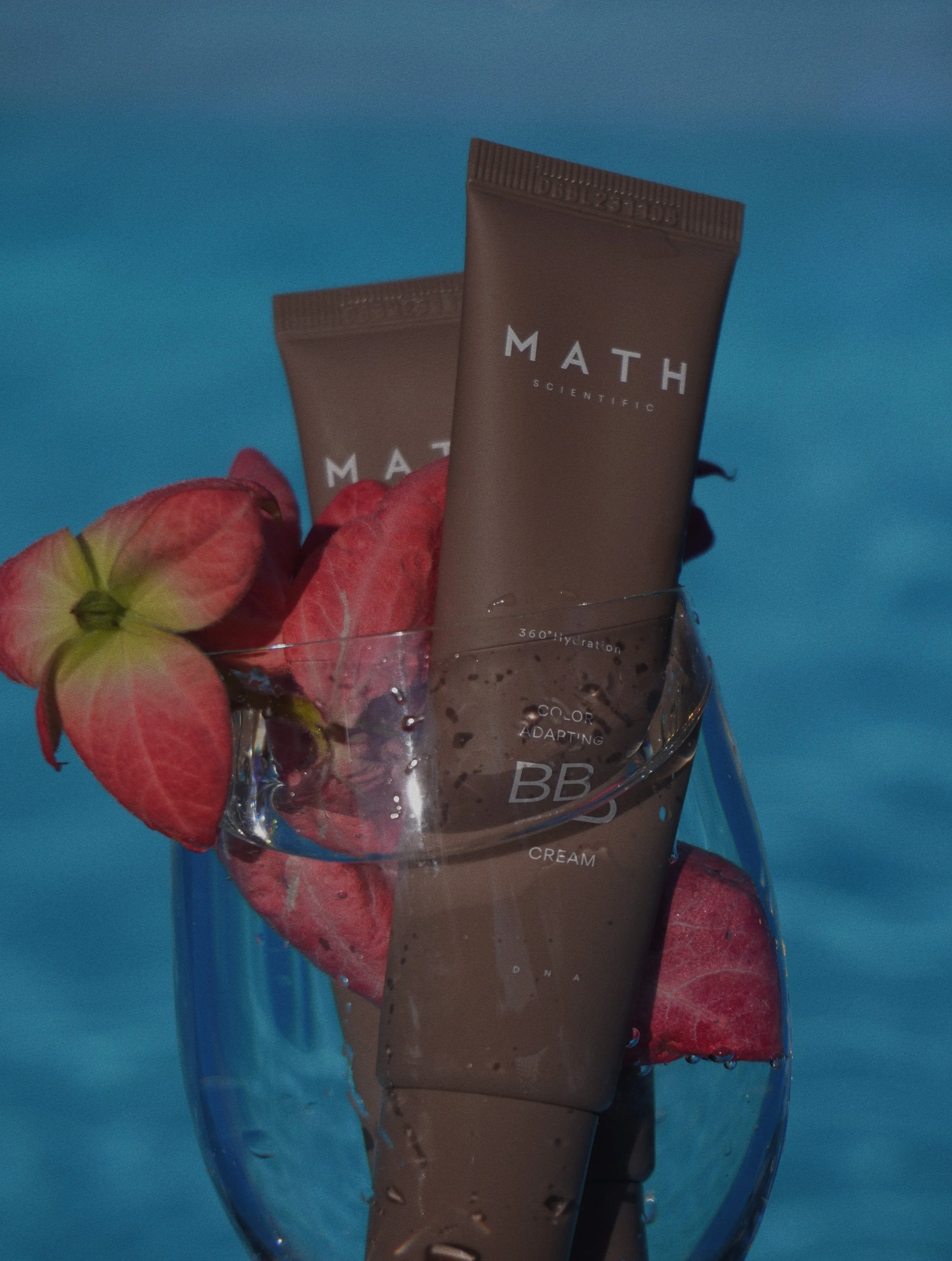 A tube of MATH Scientific BB Cream placed in a glass with pink flowers and water, with a blue outdoor background.