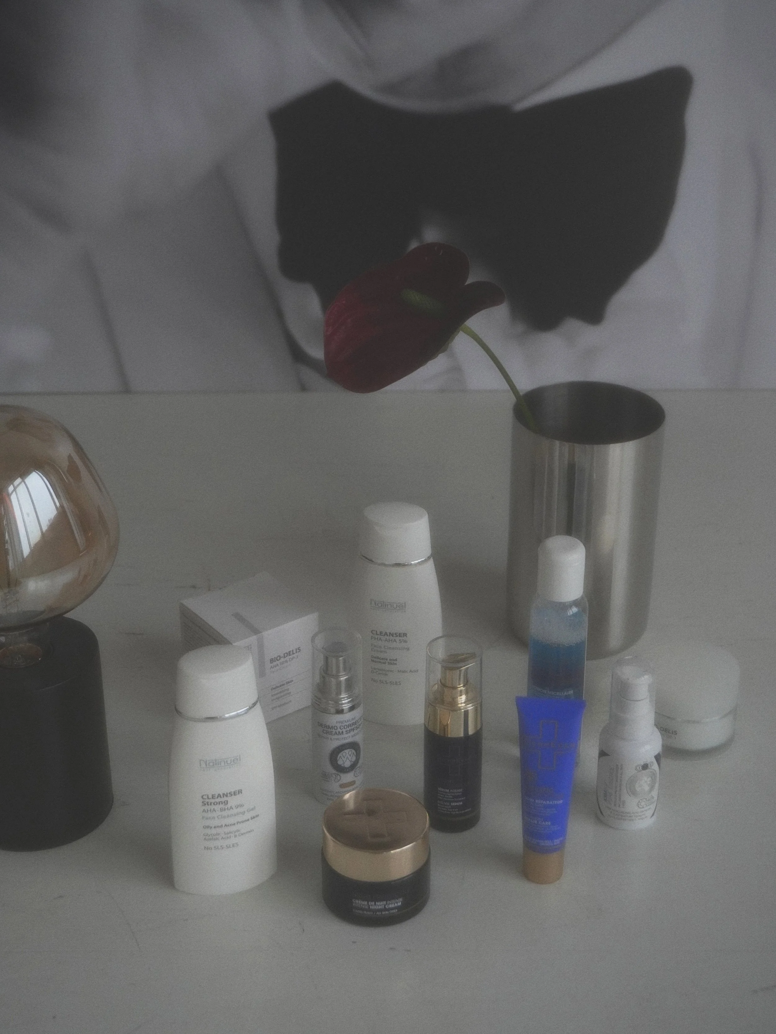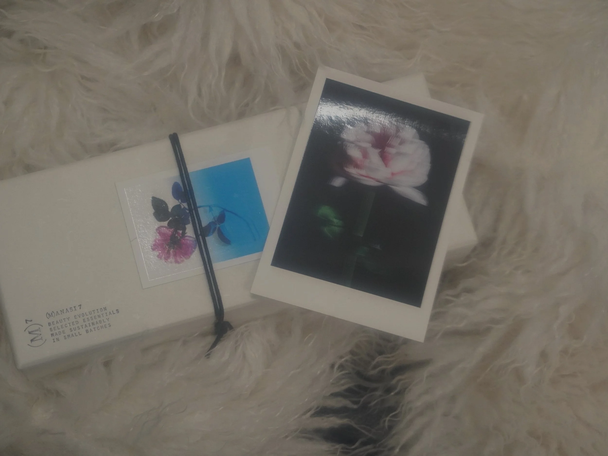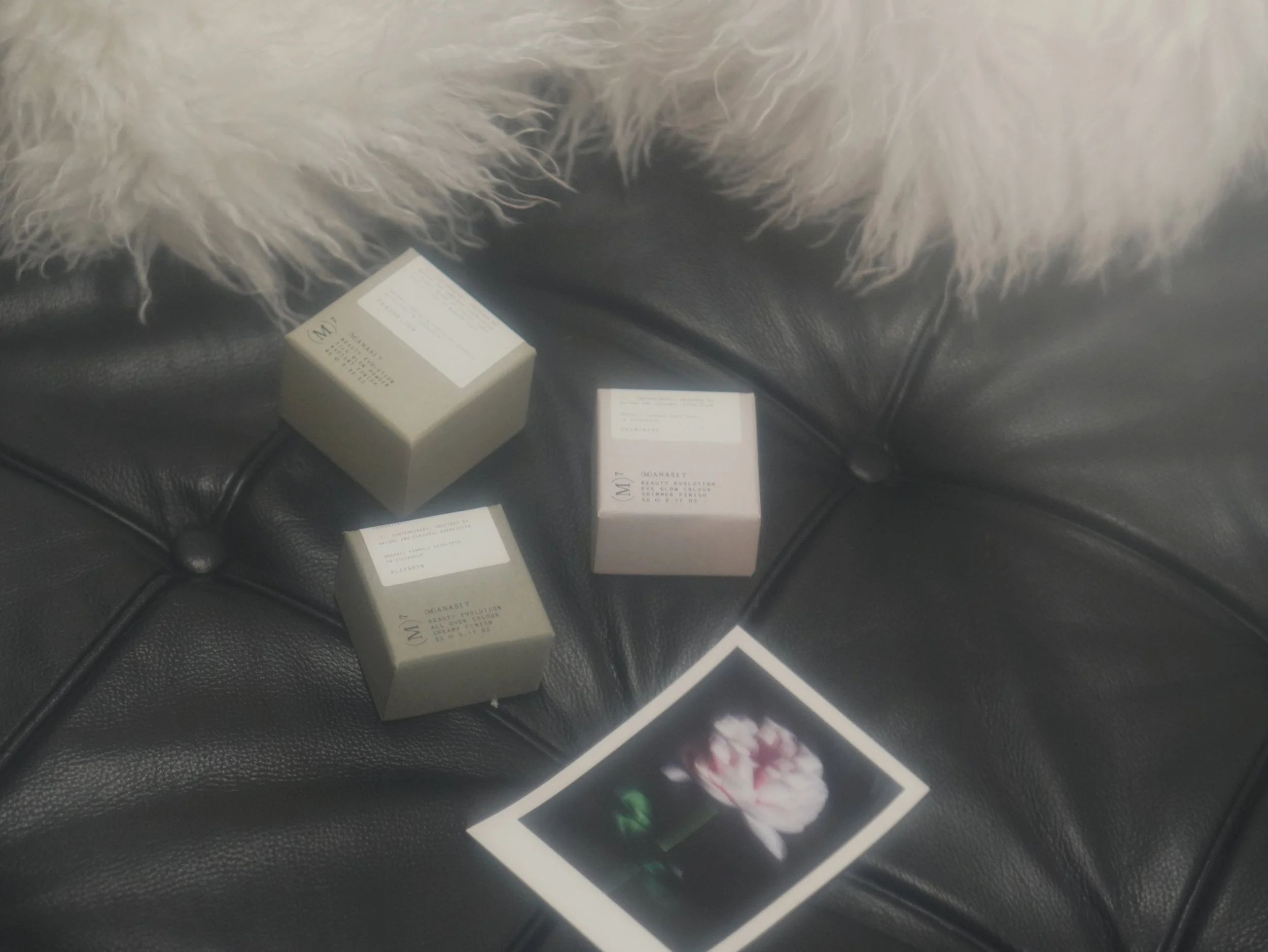 Three boxes of beauty products and a printed photograph of a flower on a black leather surface with a white fluffy fabric covering part of the top
