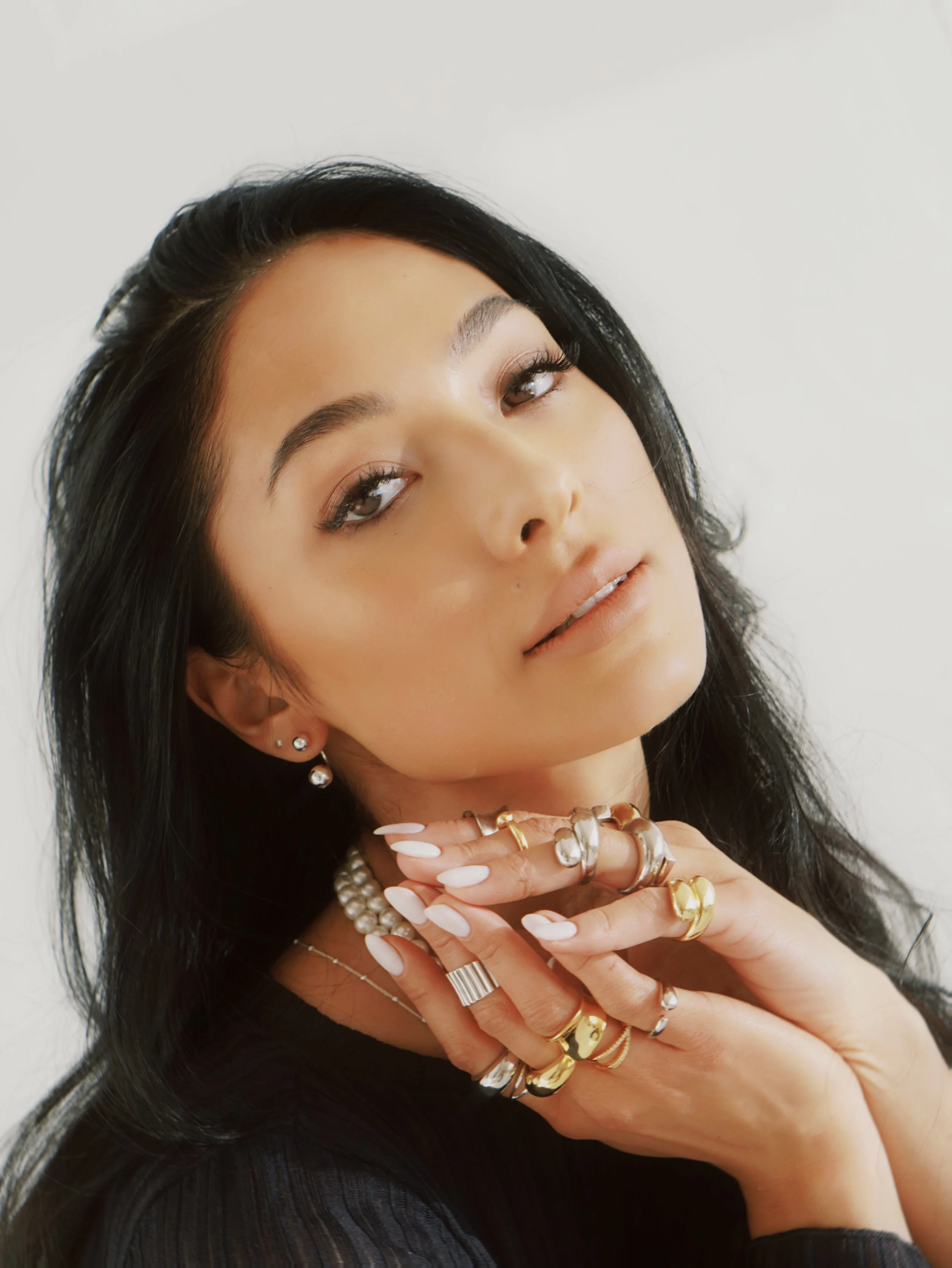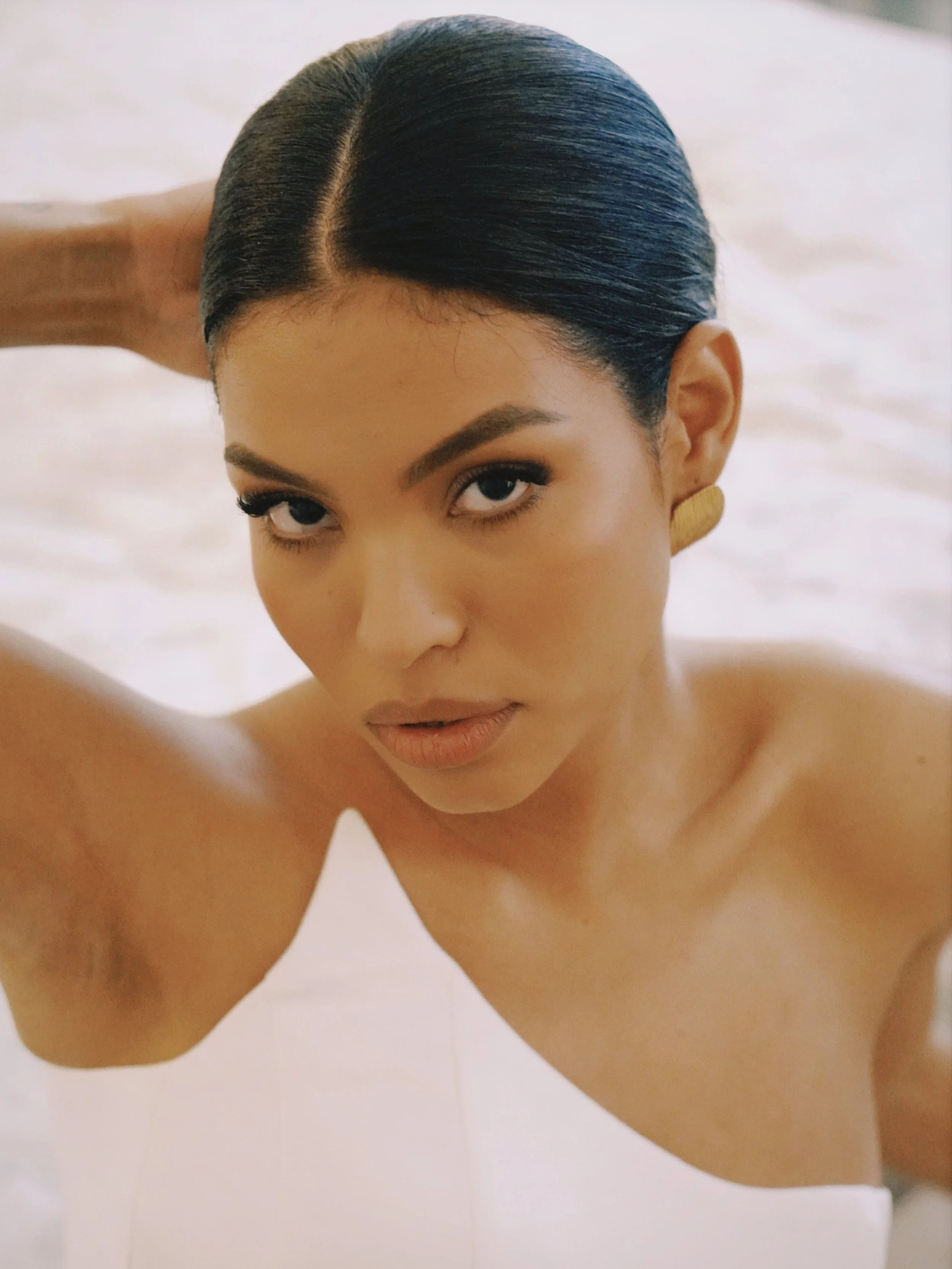 Close-up of a woman with dark hair styled in a sleek bun, wearing large earrings, with a neutral makeup look, against a blurred background.