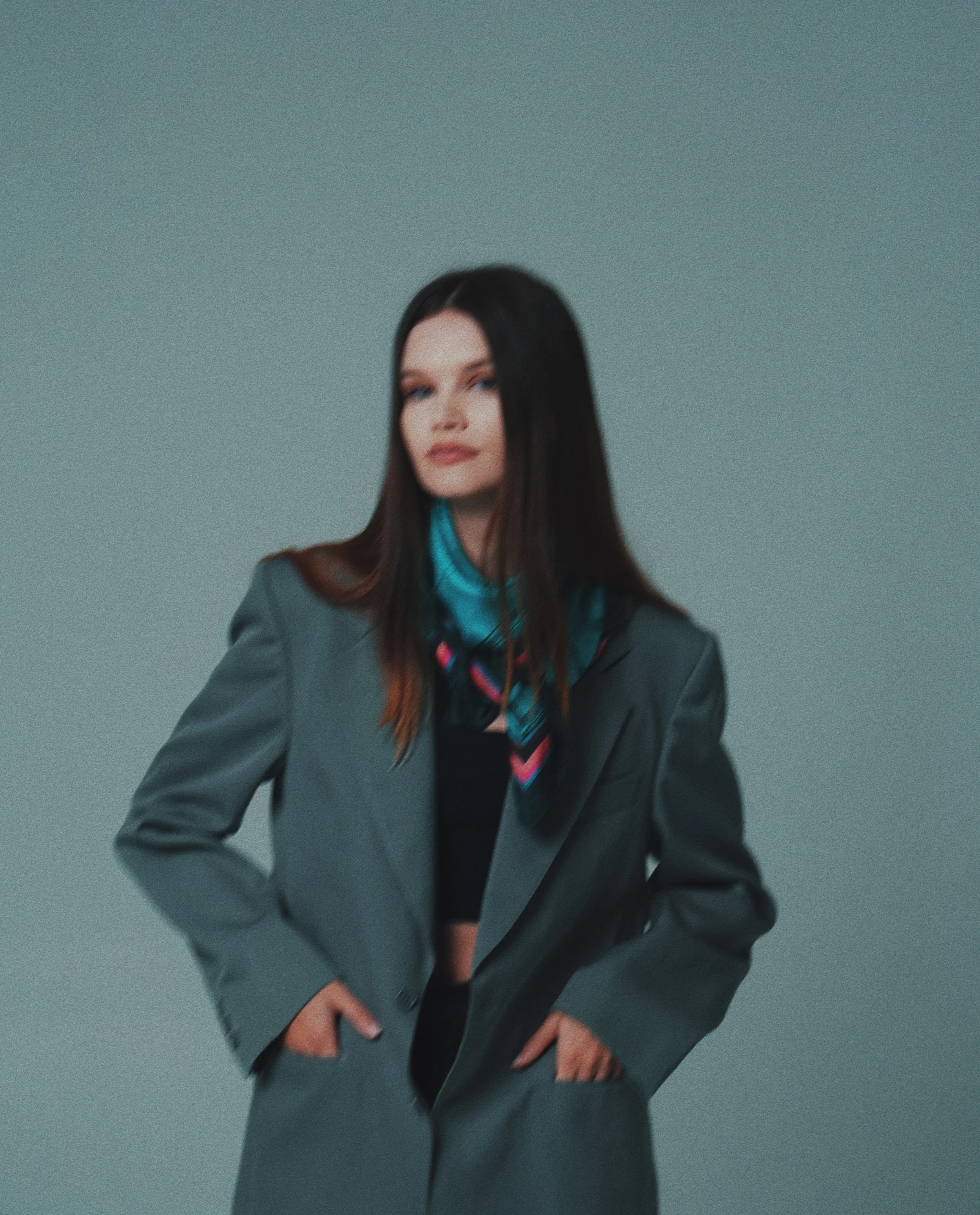 Woman with long dark hair wearing a gray blazer and a blue scarf, standing with hands in pockets against a plain background.
