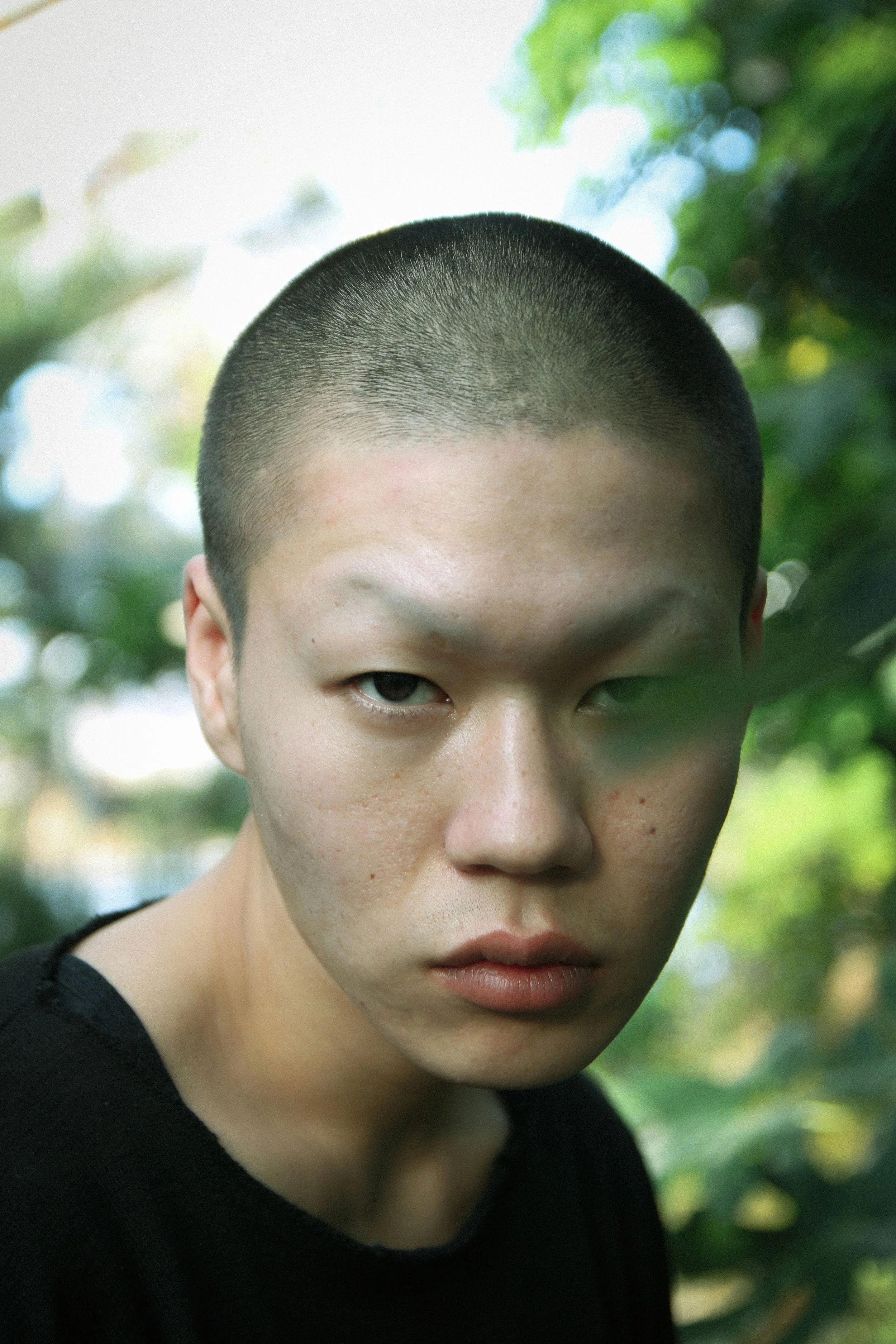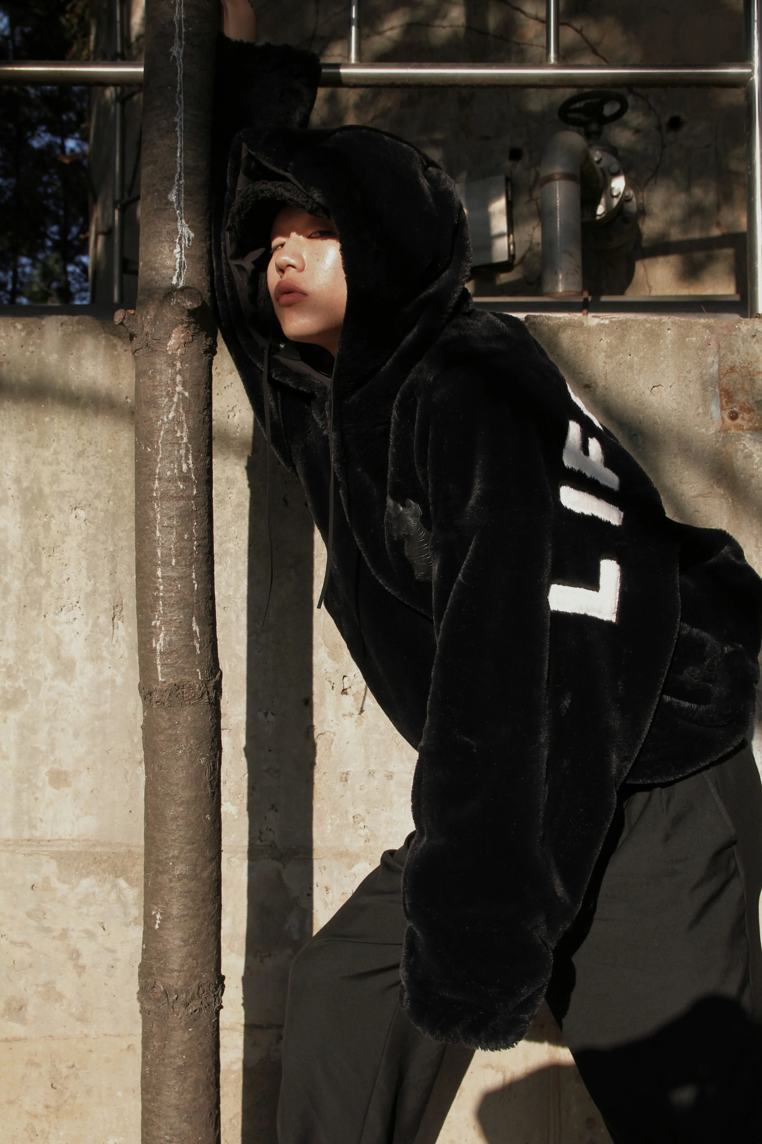 Young person wearing a black hoodie and black pants, leaning against a concrete wall with a tree and piping visible in the background, partially shielding their face from sunlight.