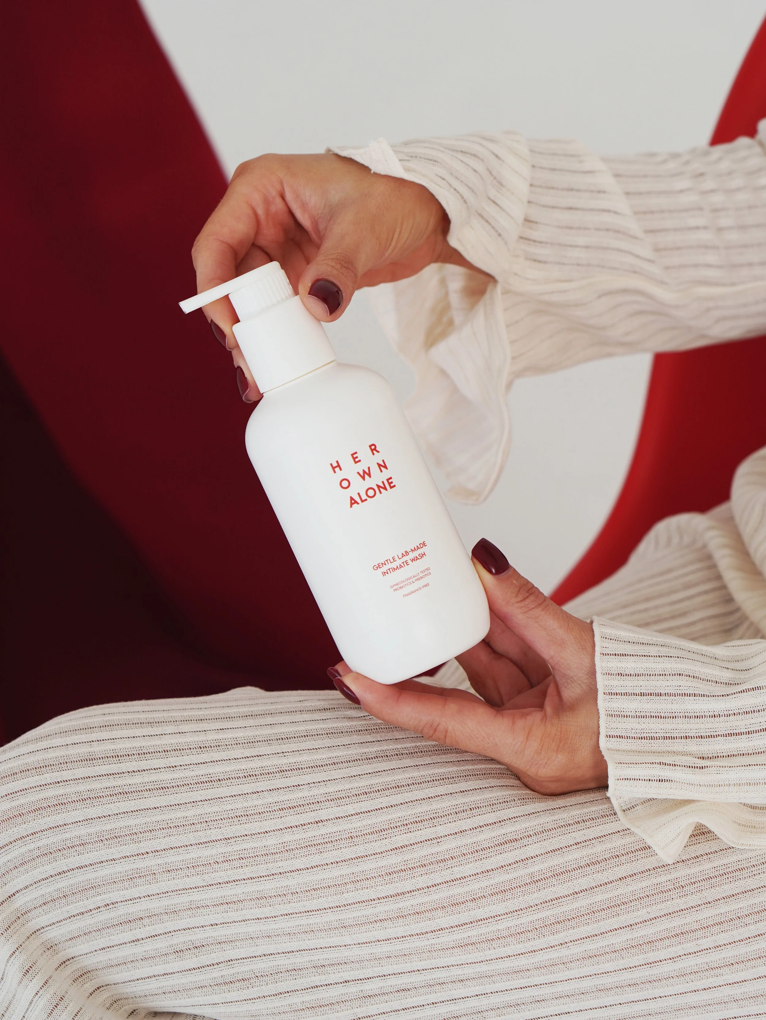 Person holding a white bottle of skincare or hygiene product with a pump dispenser, labeled "H E R  O W N  A L O N E," against a background of red and gray vertical surfaces.