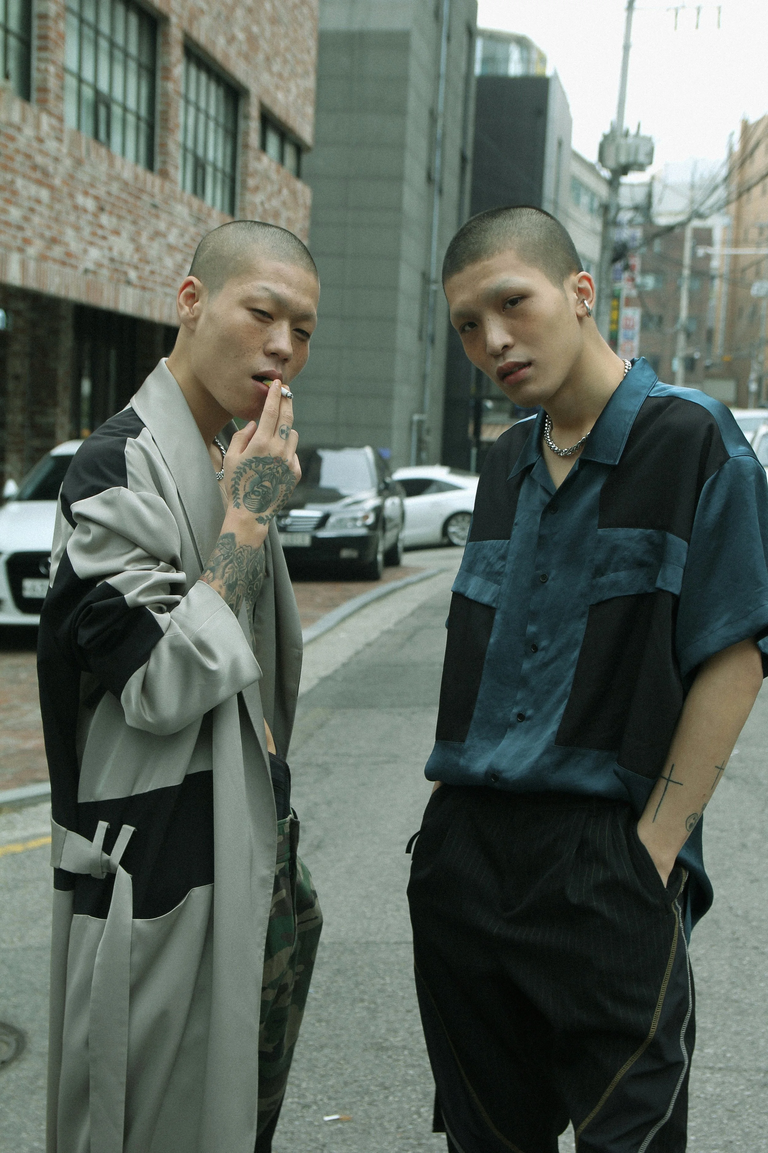 A young person with East Asian features exhales smoke on a city street, wearing a blue and black button-up shirt, silver chain necklace, and earrings.