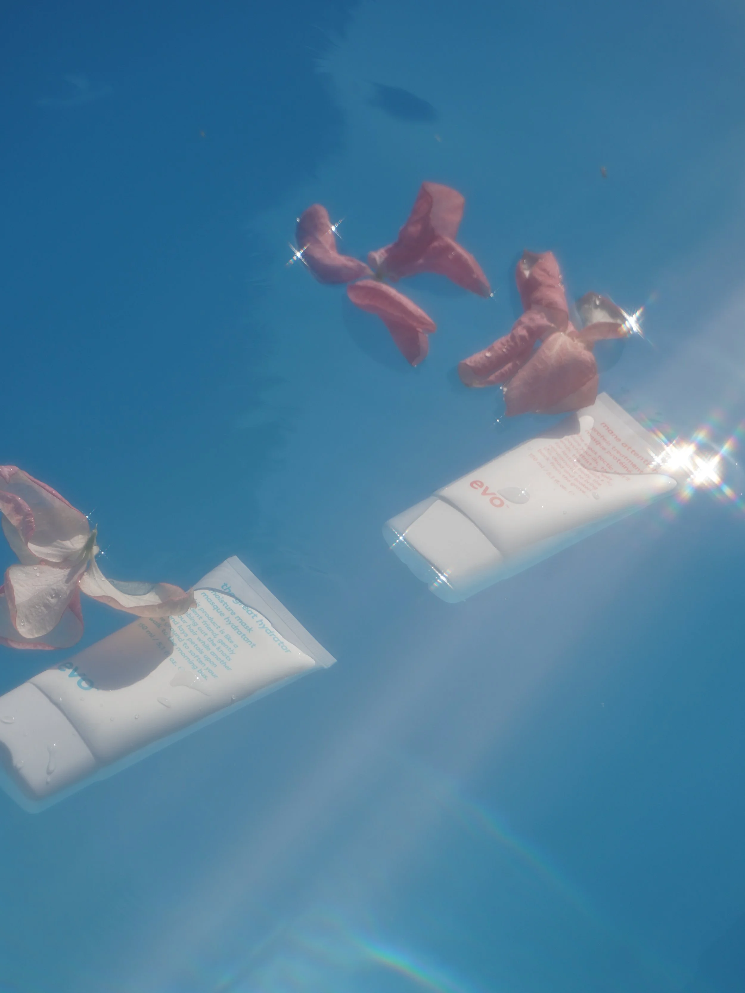 Two tubes of Evio skincare products and dried flower petals floating on a reflective blue surface with sunlight reflections.