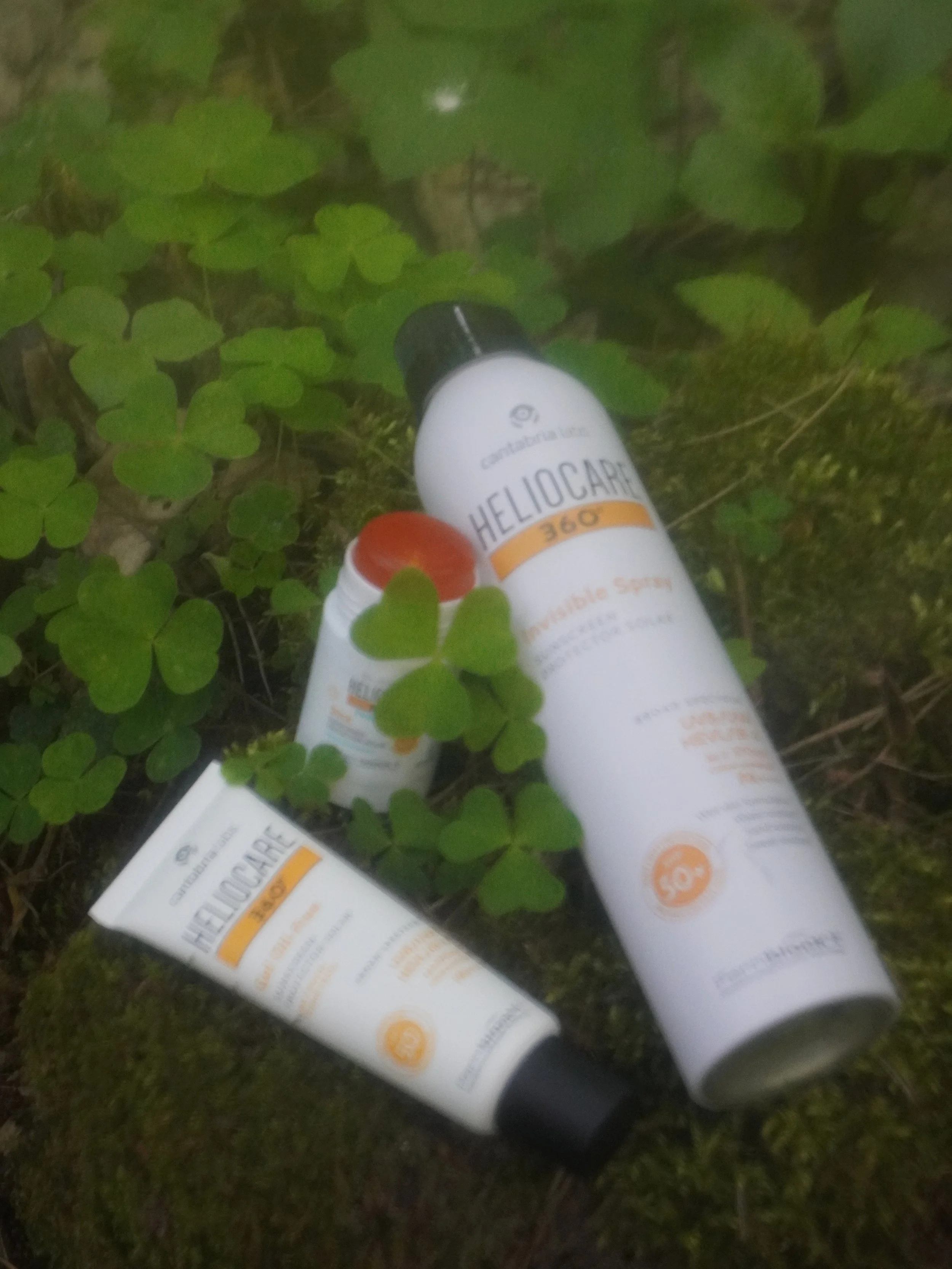 Three bottles of HelioCare 360 sun protection product among green clover leaves and moss.