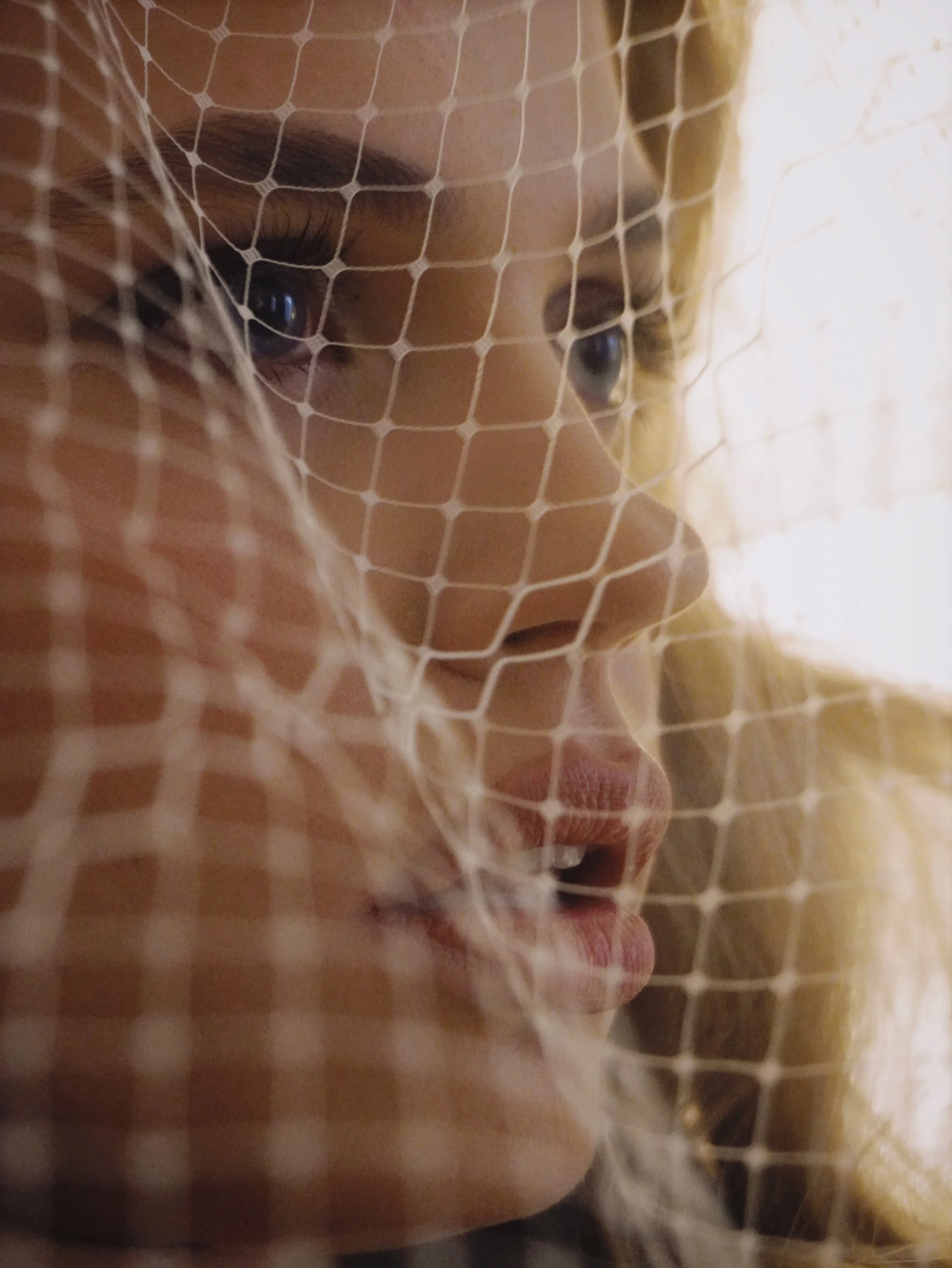 Close-up of a woman's face behind a netted veil, showing her eye, nose, and lips.