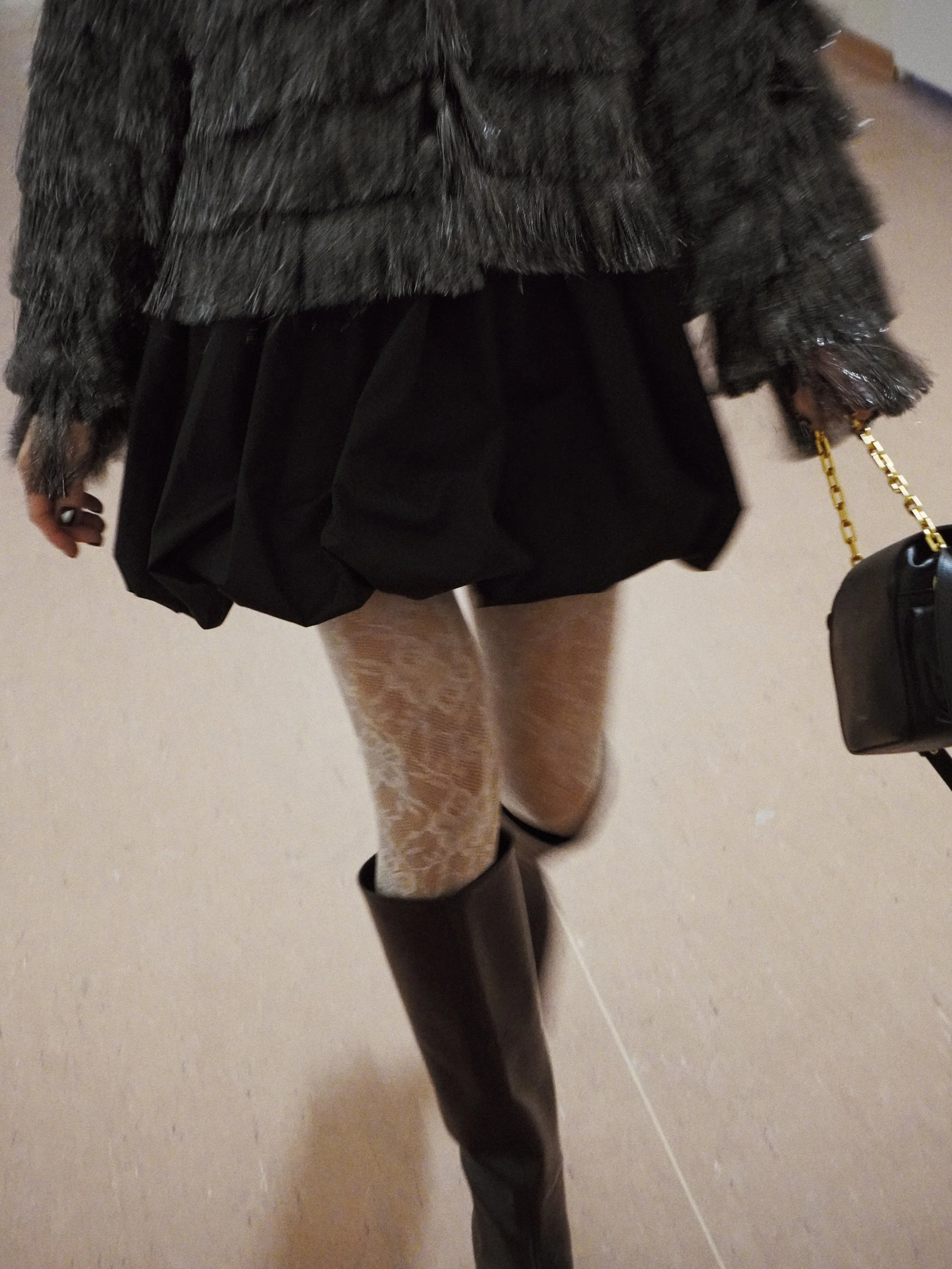 Woman wearing a black blazer, white turtleneck, floral scarf, beige lace tights, and black thigh-high boots, sitting on the floor with her legs raised.