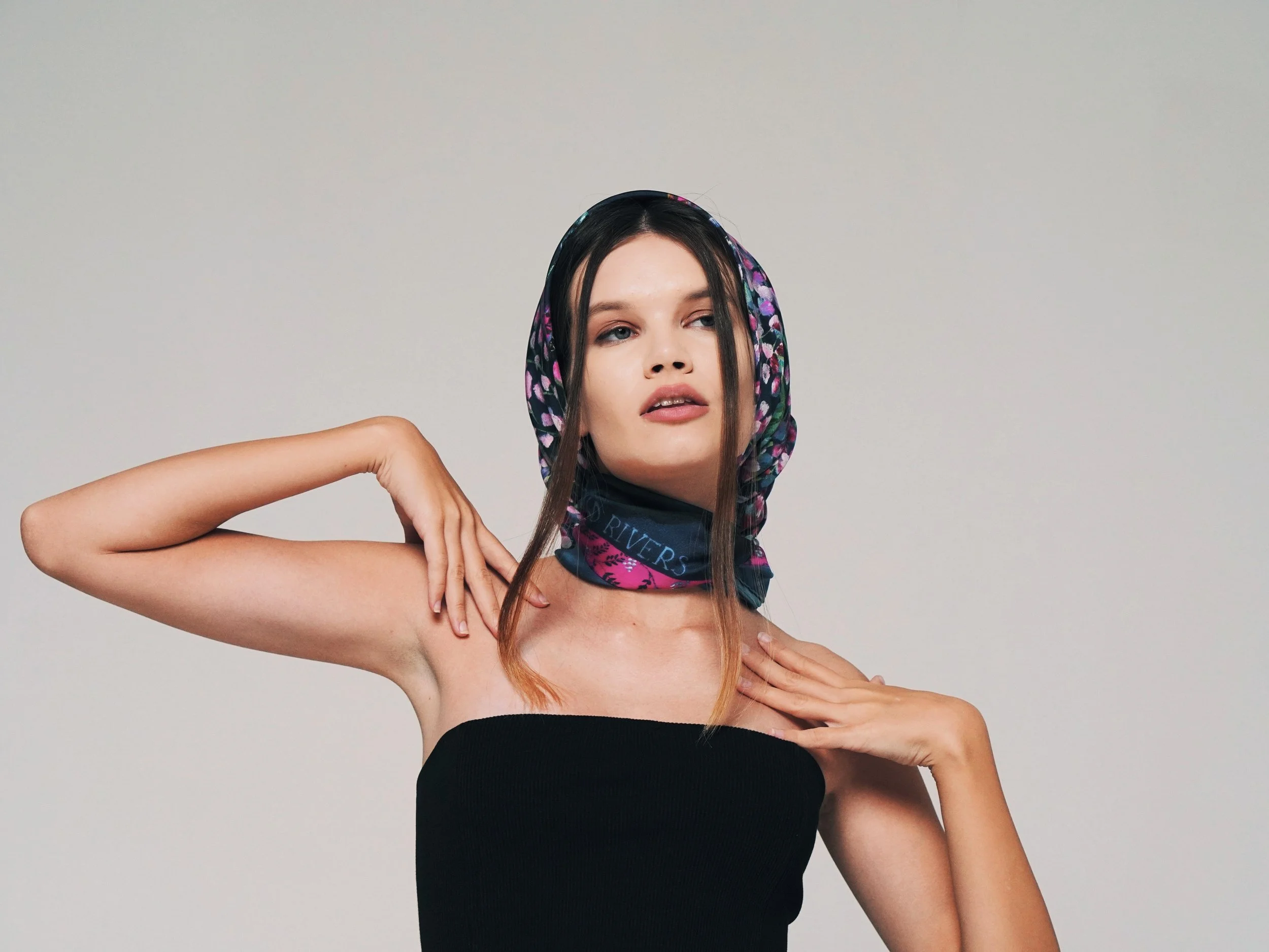 A woman with long brown hair wearing a colorful headscarf and black tube top, striking a pose with hands on her shoulders against a plain background.