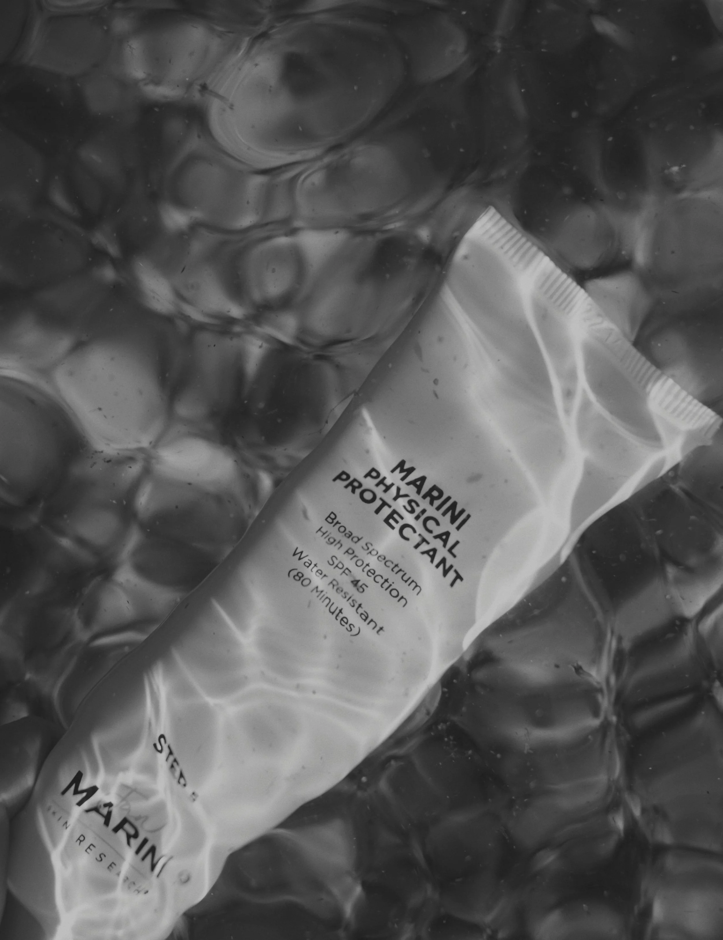 A tube of Marin Physical Protectant resting on bubble wrap with water droplets on its surface.