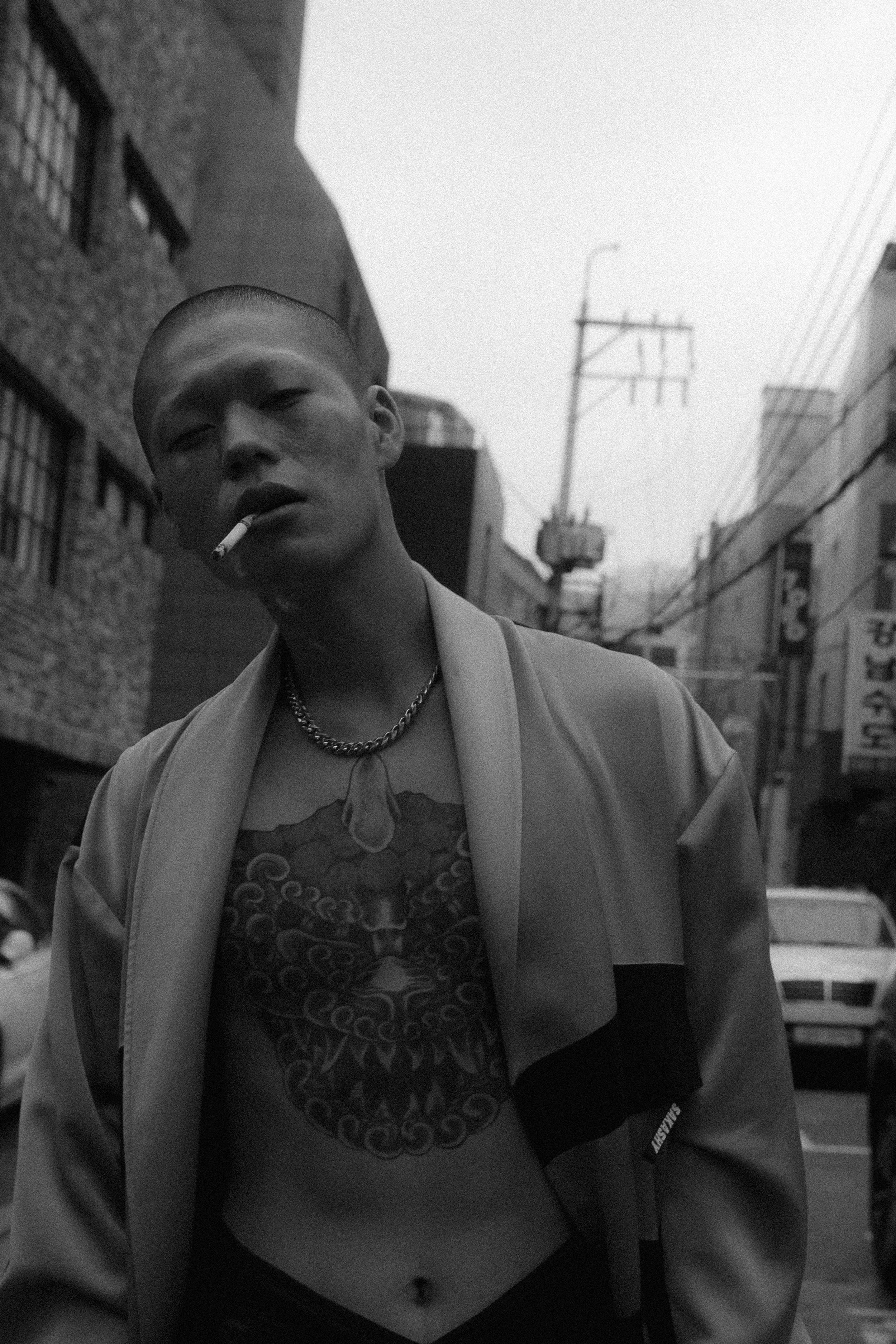 A black and white photo of a young man with a cigarette in his mouth, wearing a chain necklace and an open jacket, standing on a city street.