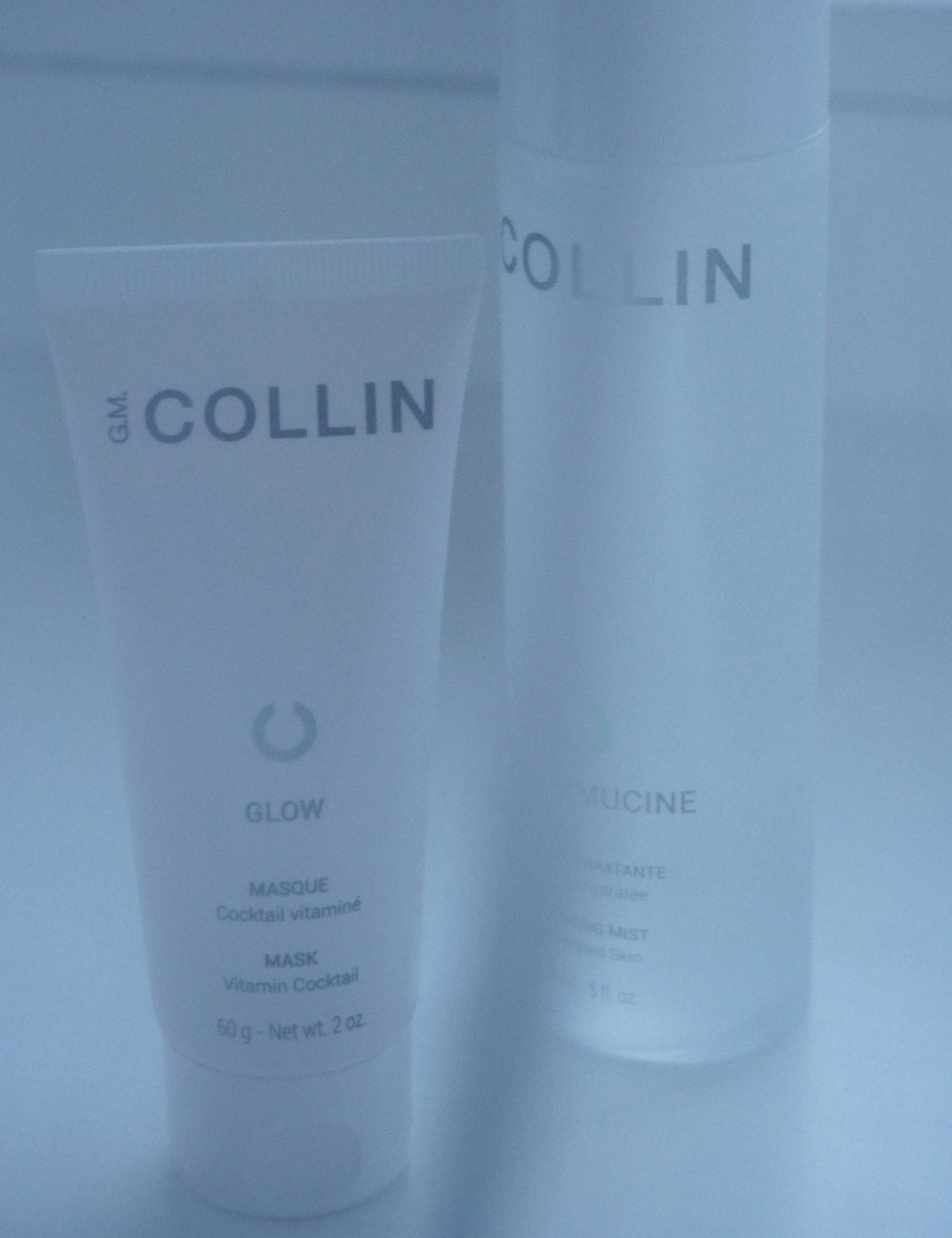 Two skincare products from GM Collin, one labeled 'Glow' and the other 'AcuTine,' placed on a flat surface.