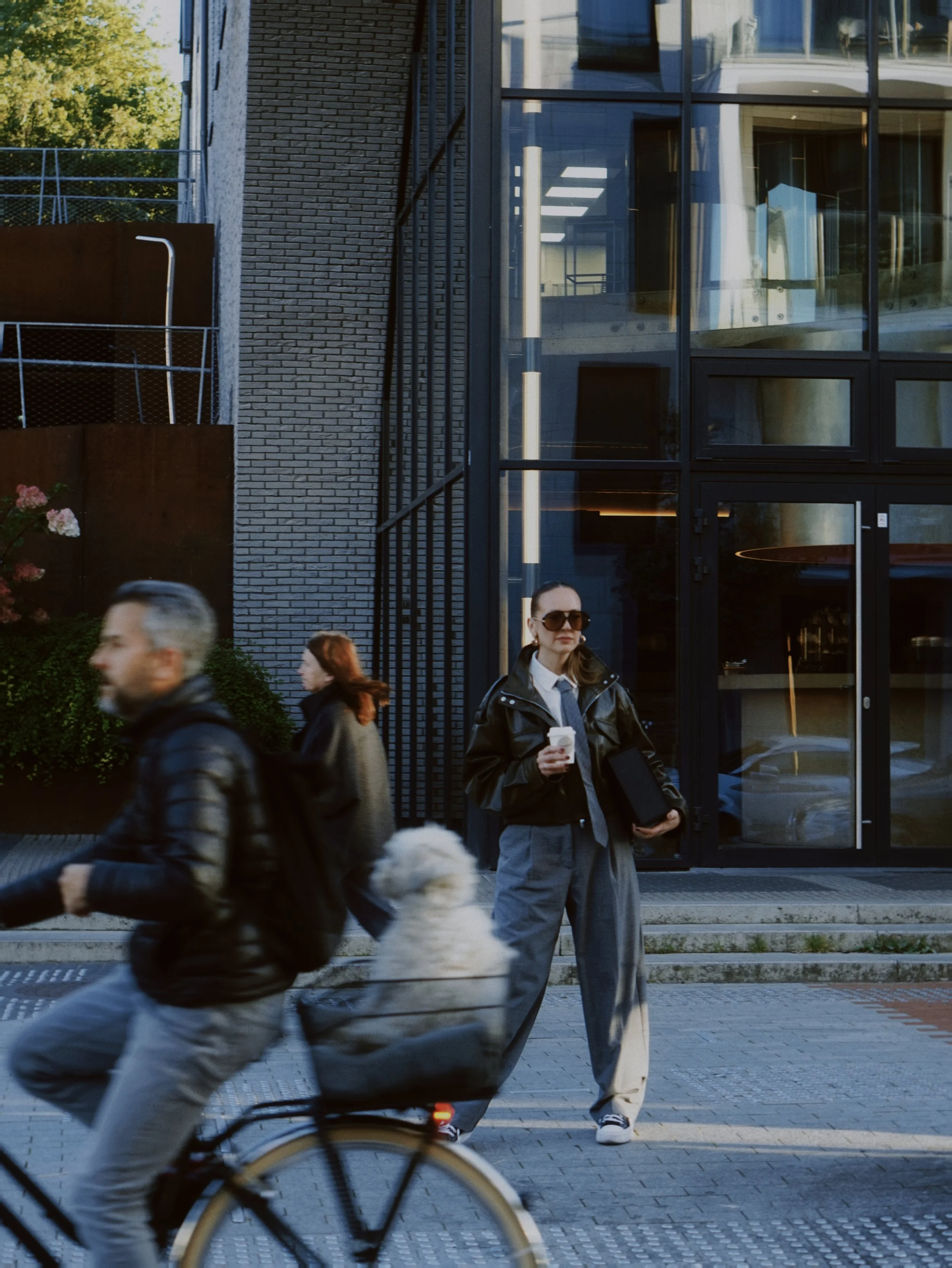 Young person with short dark hair, wearing a black sweater and light blue jeans, standing on a city street at an angle, holding a black bag, with an urban building background.