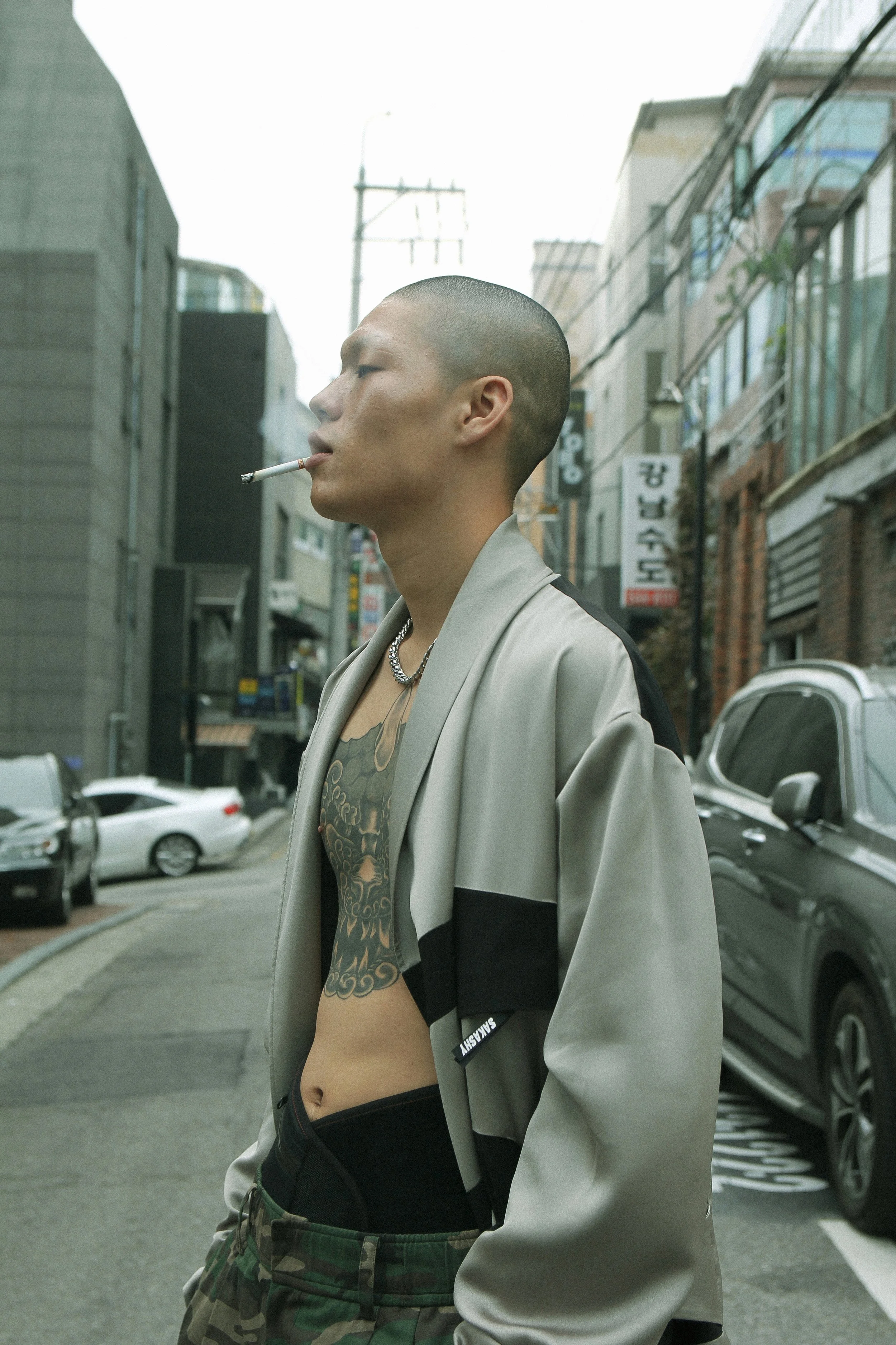 A man with a shaved head and tattoos on his chest, wearing a beige jacket and camouflage pants, smokes a cigarette while standing on a city street.