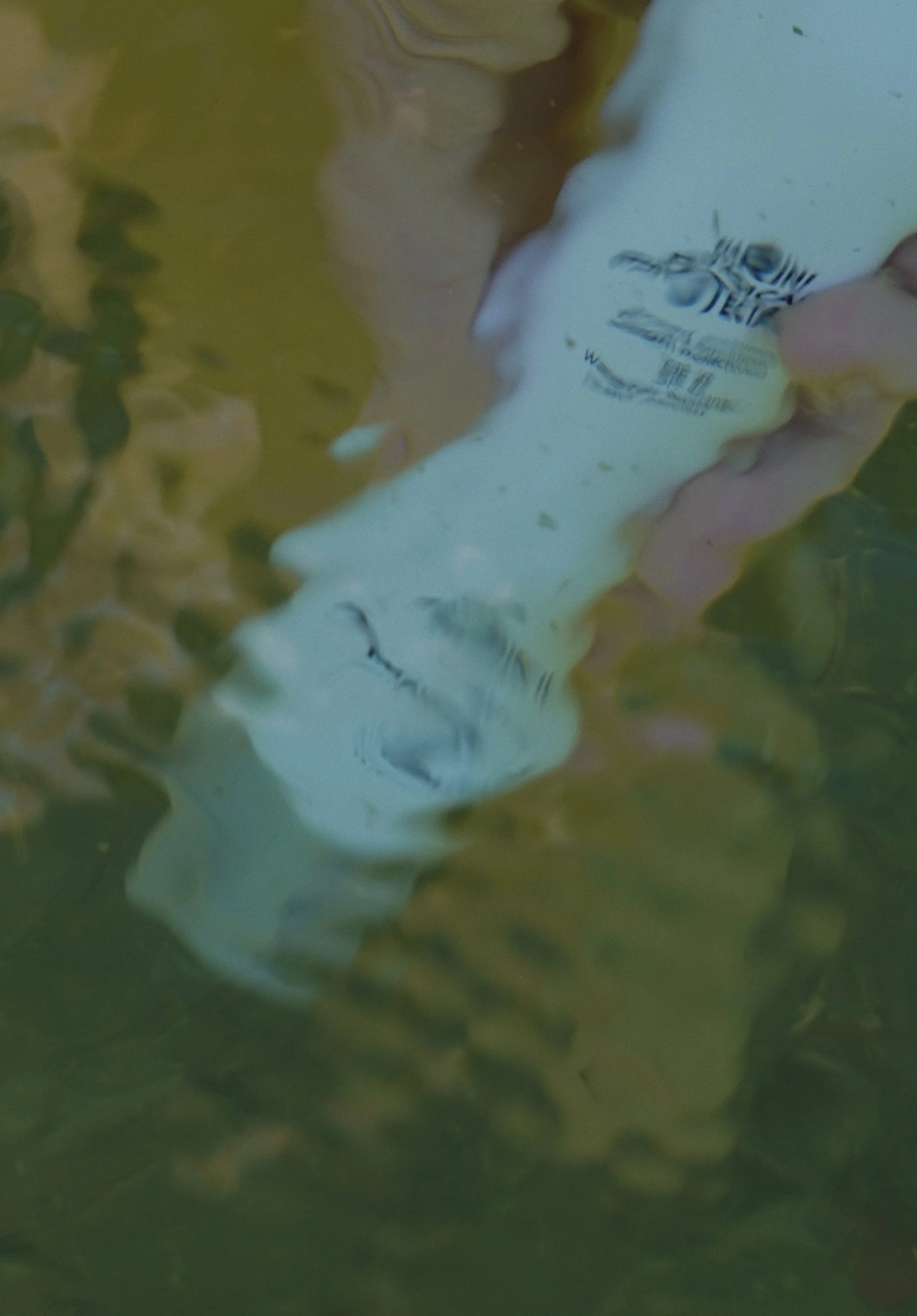 A hand holding a white plastic bottle labeled with a brand called 'June Shine' submerged under water, with greenish algae or plants surrounding it.