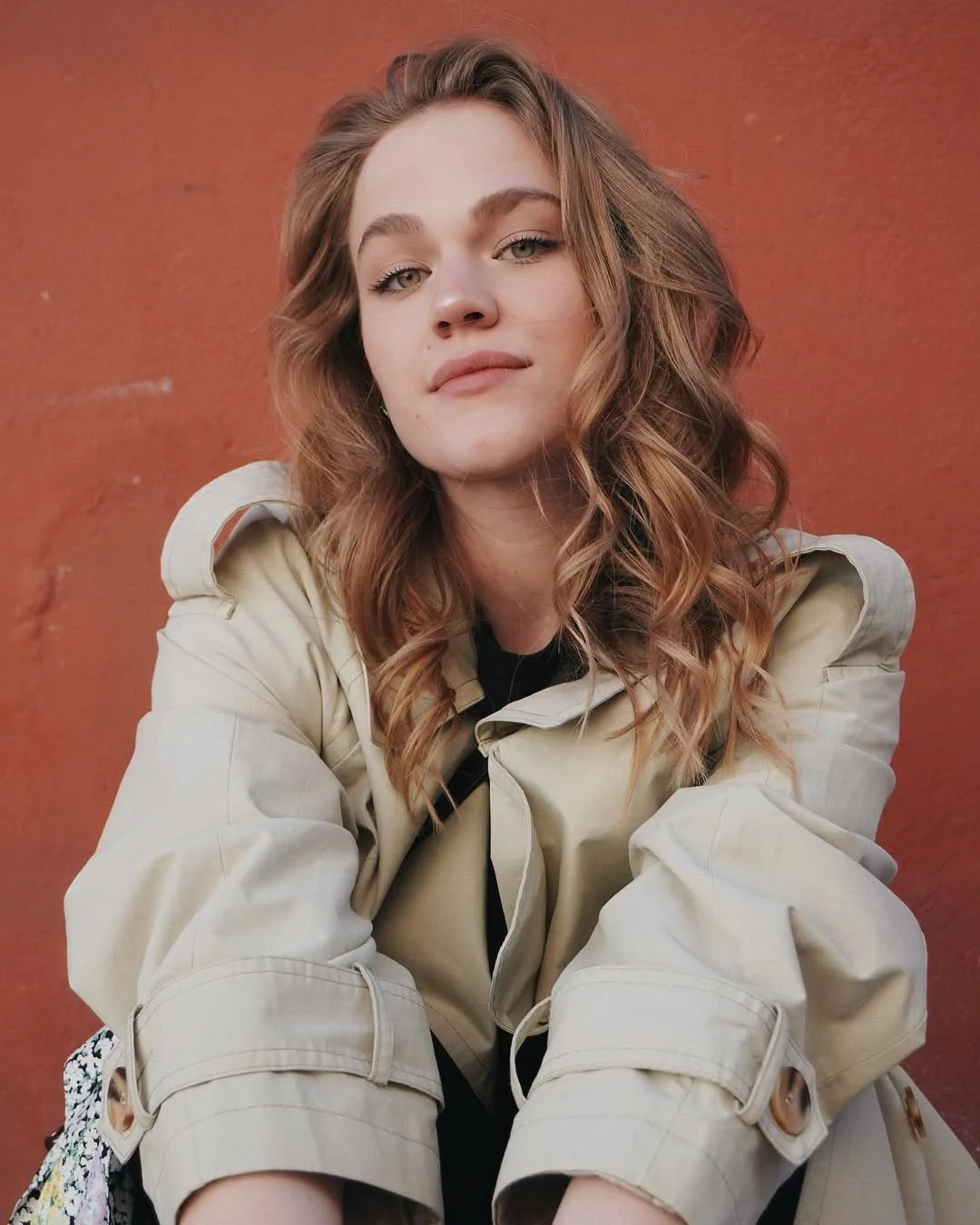 Close-up of a young woman with blonde hair and blue eyes, gazing directly at the camera with her hand resting on her cheek.