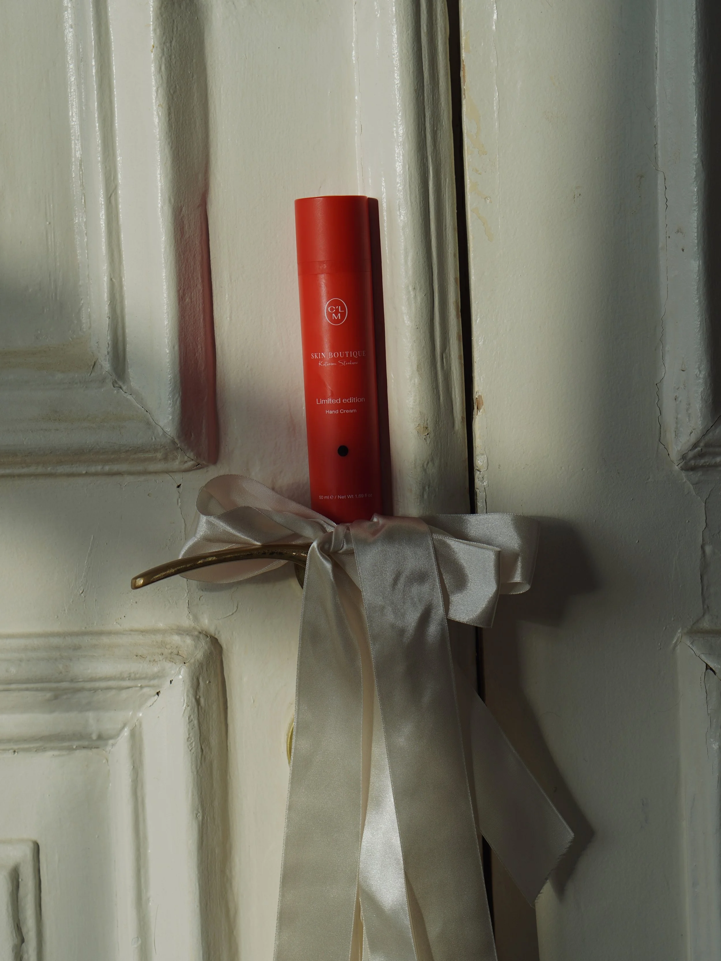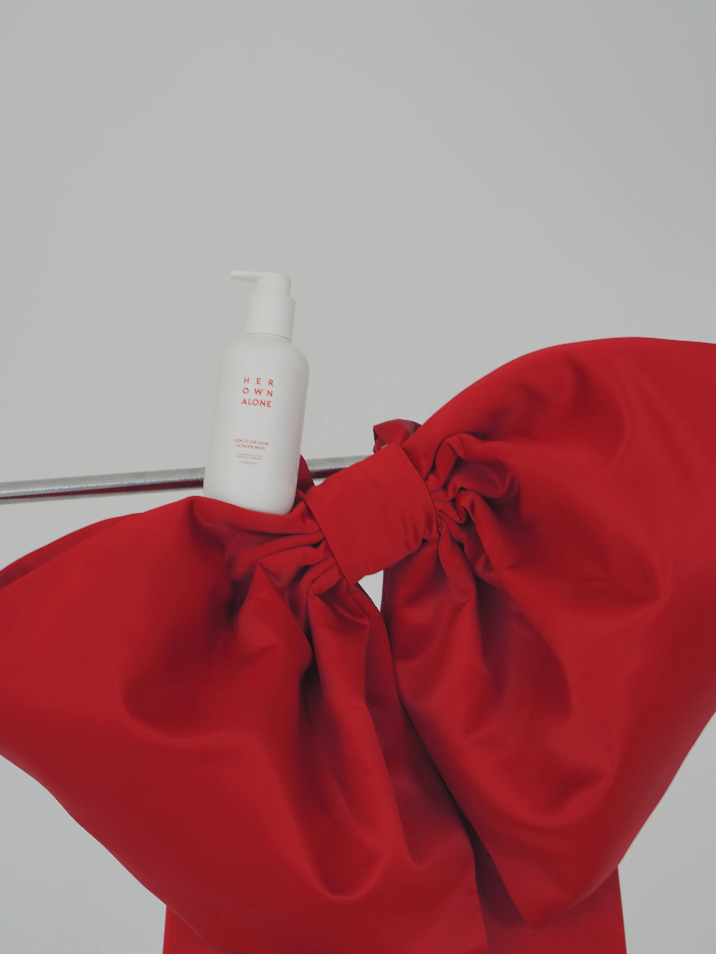 White bottle with a pump dispenser labeled "HER OWN ALONE" resting on a red fabric with a large bow, against a plain background.